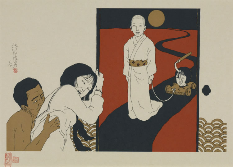 - Toshio Saeki. La apuesta ero-guro de Saeki se fundamenta en el emplazamiento de hombres y mujeres en contextos eróticos y violentos junto a seres sobrenaturales como pueden ser los tradicionales pulpos gigantes propios del hentai o demonios de todo tipo.