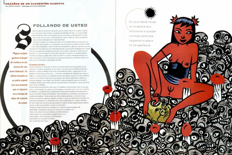 41 son los relatos eróticos que componen Hazaña erótica del cuarentón hijoputa, una obra realizada por Hernán Migoya (Ponferrada, 1951) y Santiago Sequeiros (Buenos Aires, 1971) y editada por la editorial Dibbuks. Los relatos que aparecen en Hazaña erótica del cuarentón hijoputa ya fueron publicados en su día en la revista Primera Línea. Ahí empezó a publicarlos Hernán Migoya en 2013 y es ahí, en esa misma publicación, donde fueron apareciendo esos 41 relatos hasta el año pasado.