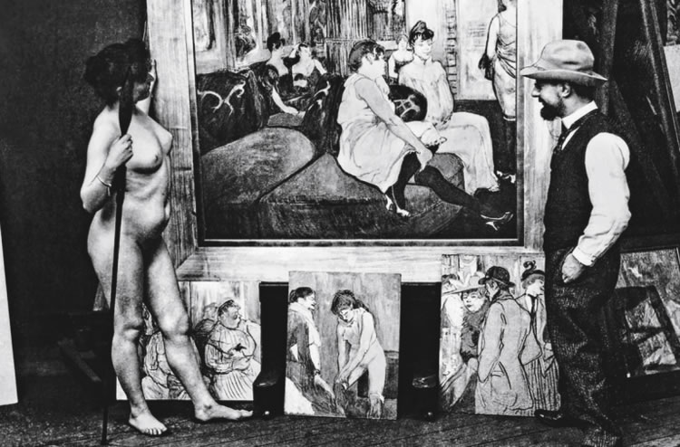 Aunque si hay un pintor de la época del Impresionismo que convirtió el mundo de la prostitución en temática habitual de su obra y a las prostitutas en personajes estelares de su pintura ese pintor fue Toulouse-Lautrec. Toulouse-Lautrec, habitual de los prostíbulos parisinos y documentalista pictórico de lujo de la vida nocturna del París de finales del siglo XIX, retrataba a las prostitutas de su tiempo realizando actividades cotidianas. Toulouse-Lautrec pintaba a prostitutas mientras se cambiaban, mientras descansaban, mientras esperaban alguna inspección médica, escenas íntimas entre dos de ellas… Rechazado por la nobleza a la que por orígenes pertenecía, el mundo de la farándula y de la prostitución sirvió a Toulouse-Lautrec de refugio y, a la vez, de fuente de inspiración.