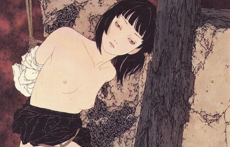 No es ése el caso, sin embargo, de Takato Yamamoto, ya que sutileza y sensualidad serían, sin duda, dos vocablos que servirían muy bien para calificar la obra artística de este ilustrador nacido en la prefectura de Akita (Japón) en 1960. En las ilustraciones eróticas de Takato Yamamoto podemos encontrar la indeleble huella estilística dejada en el artista y en su forma de dibujar por las viejas xilografías japonesas creadas en el siglo XVII a partir de una técnica que recibe el nombre de Ukiyoé. Es el uso de esa técnica la que da a las ilustraciones de Takato Yamamoto ese toque sutil y elegante que sirve para suavizar lo macabro de lo representado y para darle un aire de manga moderno y, al mismo tiempo, decadente.
