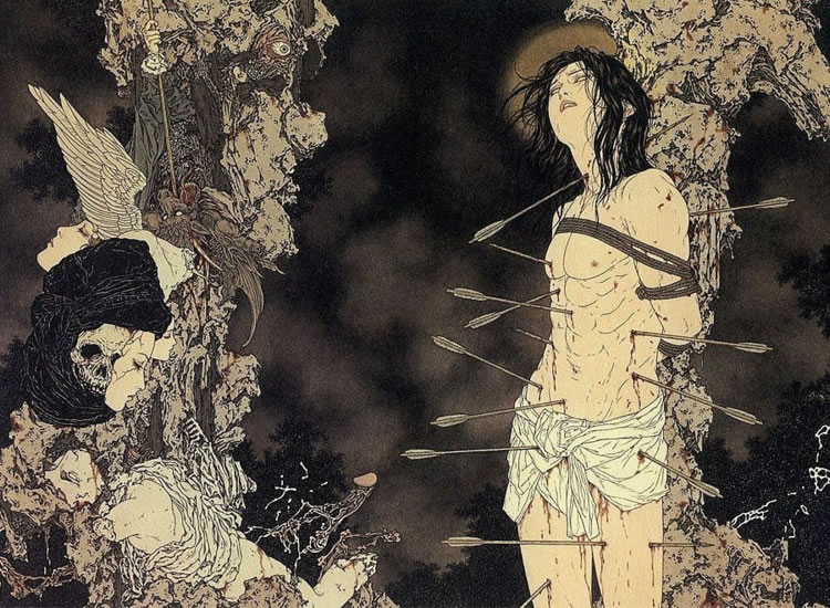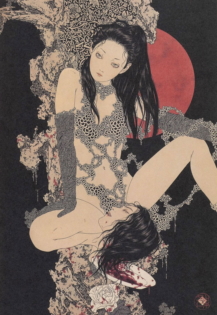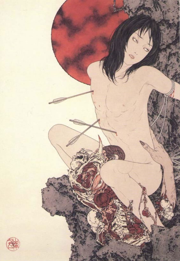 Las ilustraciones eróticas de Takato Yamamoto parecen brotar de un sueño cuajado de pesadillas. En esas pesadillas, Eros y Tánatos se entrelazan entre sí danzando bailes macabros que, sin embargo, no abandonan del todo su carga erótica. Aquí os dejamos unas muestras del arte de un ilustrador que ha visto expuesta su obra en numerosas exposiciones de múltiples países.