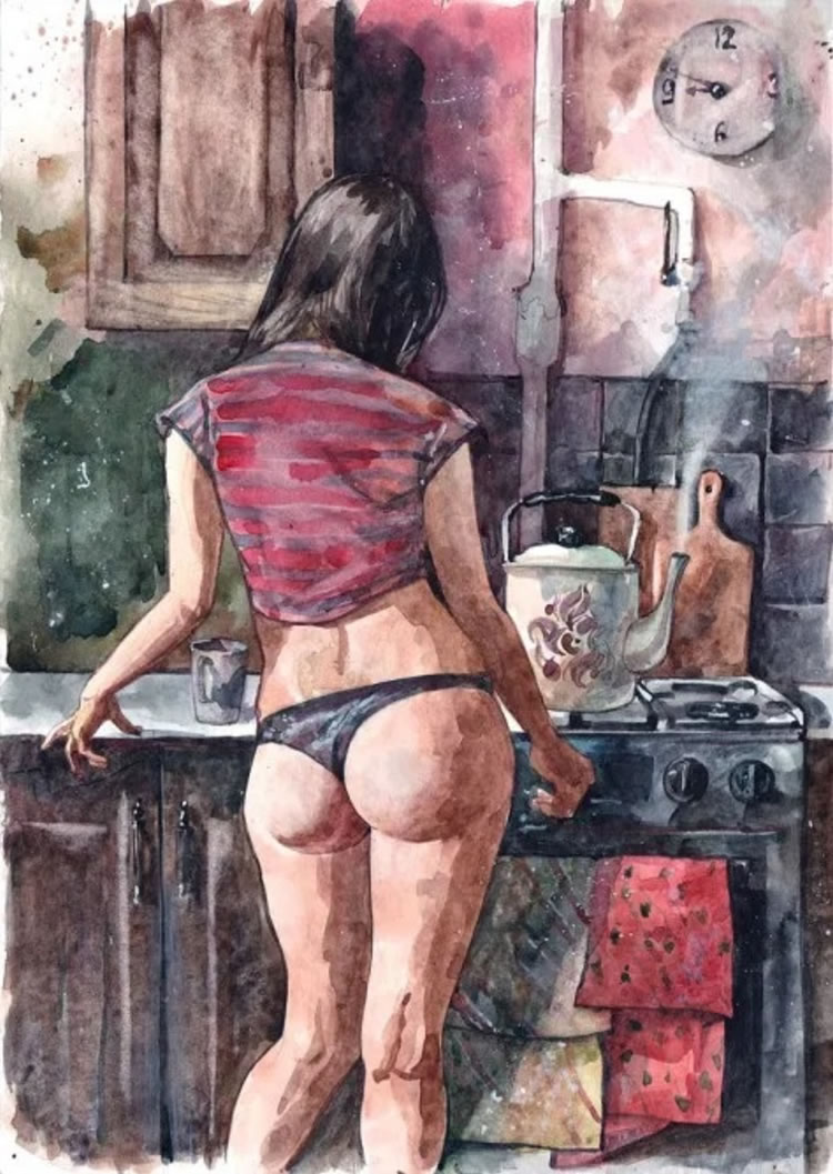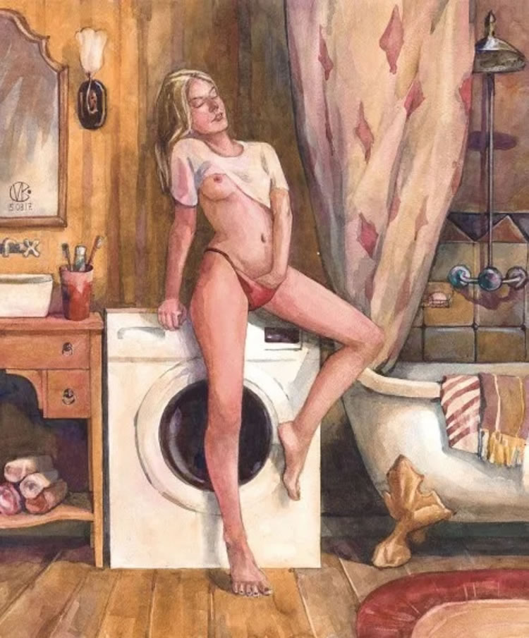 Desde que dio ese paso, Valéria Ko ha realizado muy variados trabajos artísticos. Ha hecho retratos, ha realizados cómics, ha dibujado caricaturas para diversas editoriales, ha diseñado campañas publicitarias para diversas marcas comerciales, ha realizado, incluso, trabajos de animación. Para realizar trabajos tan diversos la dibujante rusa ha empleado técnicas muy variadas, desde las más avanzadas del universo digital hasta las más tradicionales. Entre todas ellas, sin embargo, hay una con la que Ko se siente especialmente cómoda: la acuarela. La técnica de la acuarela sirve a Valéria Ko para plasmar en sus ilustraciones a mujeres que en muchas ocasiones aparecen retratadas en su ámbito doméstico y haciendo gala de un erotismo y una sensualidad que la mayor parte de las veces destaca por su naturalidad pero que, de tanto en tanto, se muestra mucho más atrevida y descarada, mucho más obscena.